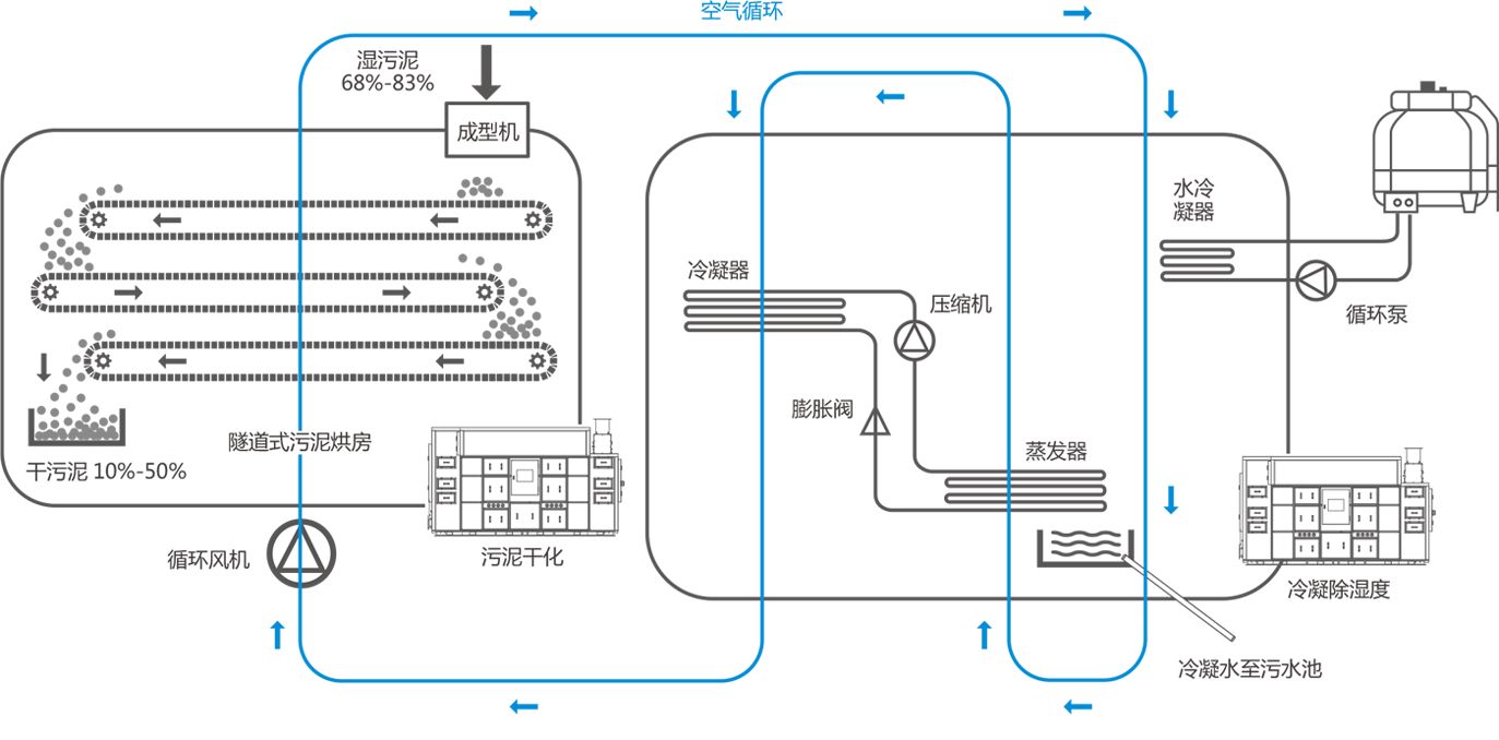 污泥除濕干化機是利用除濕熱泵對污泥采用熱風循環冷凝除濕烘干;